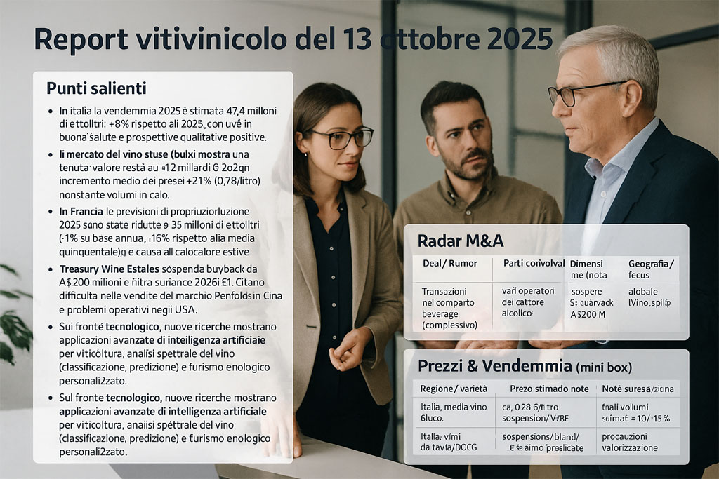- Italian harvest estimates indicate a potential harvest of 47.4 million hectoliters in 2025, an 8% increase compared to 2024, with grapes in good physiological condition and peaks of territorial excellence.
