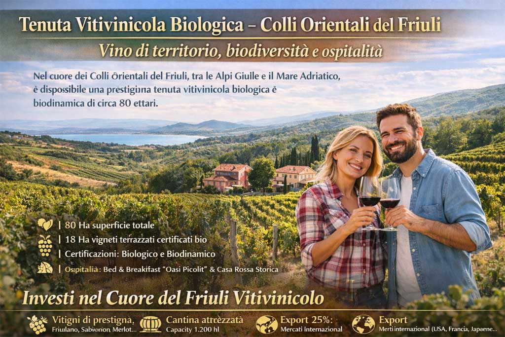 In the heart of the Colli Orientali del Friuli, between the Julian Alps and the Adriatic Sea, a prestigious organic and biodynamic wine estate of approximately 80 hectares is available.