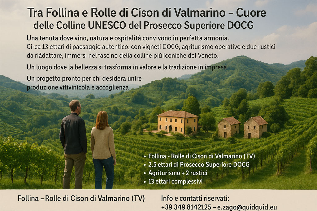 In the heart of the Prosecco Superiore Hills, a UNESCO World Heritage Site, this prestigious wine estate is offered for sale. It includes DOCG vineyards, renovated buildings ready for agritourism activities, and an approved project for the construction of a new production and hospitality winery.