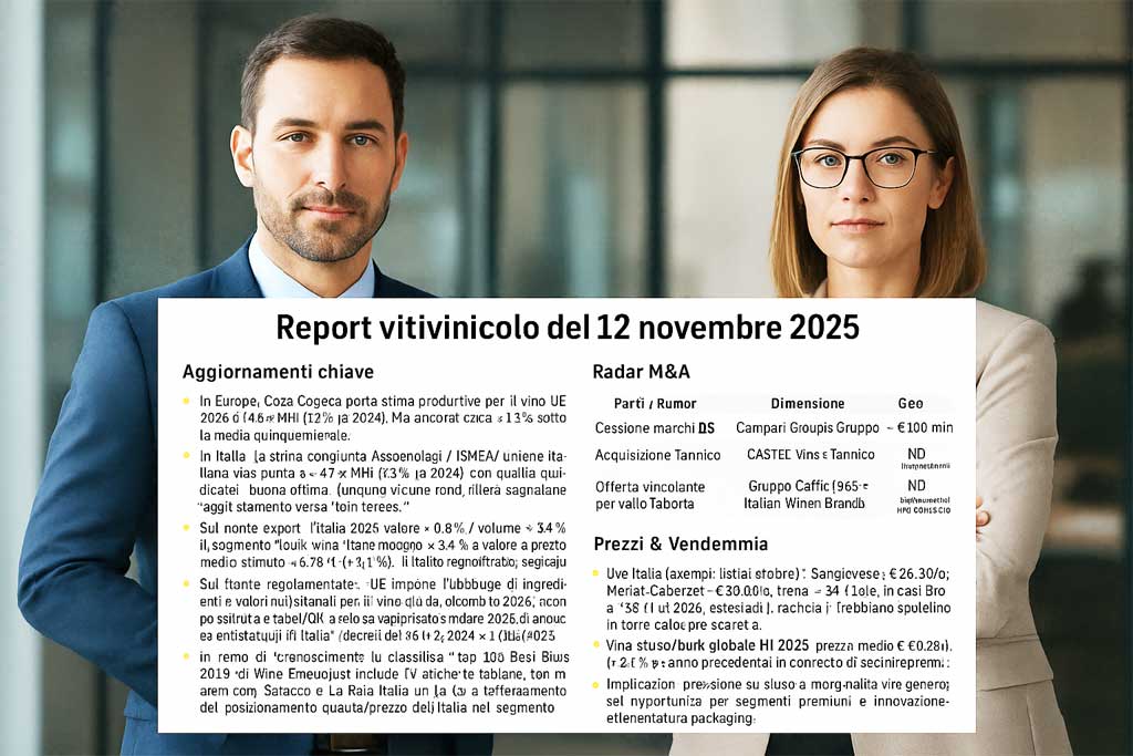 – Italian stocks as of 09/30/2025: approximately 36 Mhl , -9.6% compared to July but 1.3% on an annual basis → signals residual stock and potential pressure on bulk wine and generic grape margins.