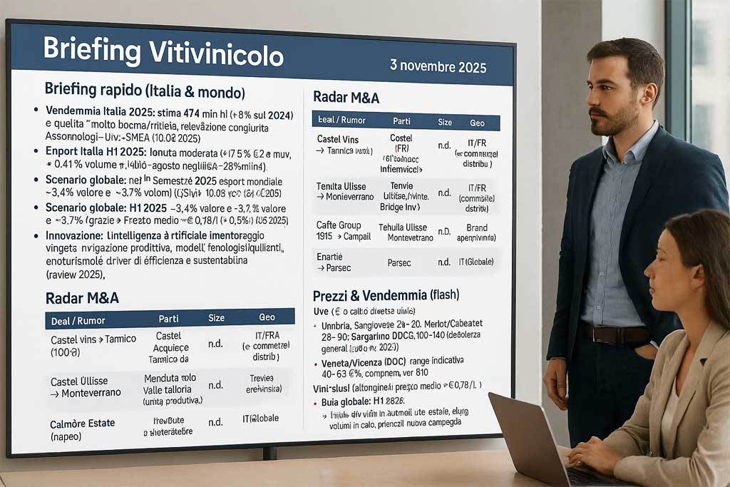 • Italy’s 2025 harvest: estimated 47.4 million hl (8% higher than 2024) and “very good/excellent” quality; joint Assoenologi–UIV–ISMEA survey (10.09.2025).