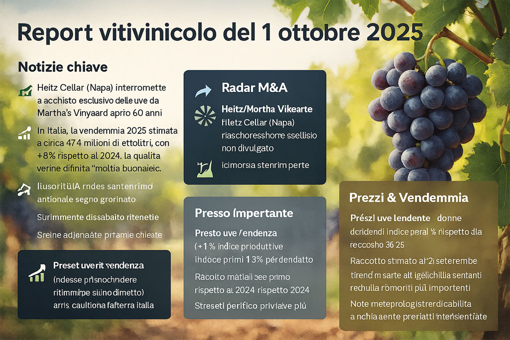 Trend vs. previous year : Table wines show more instability in the price lists, while DOC/DOCG wines have more independent and resilient dynamics. Weather/yield notes : In some Italian areas, ripening has slipped by 5-7 days; night harvesting used to preserve aromatic profiles.