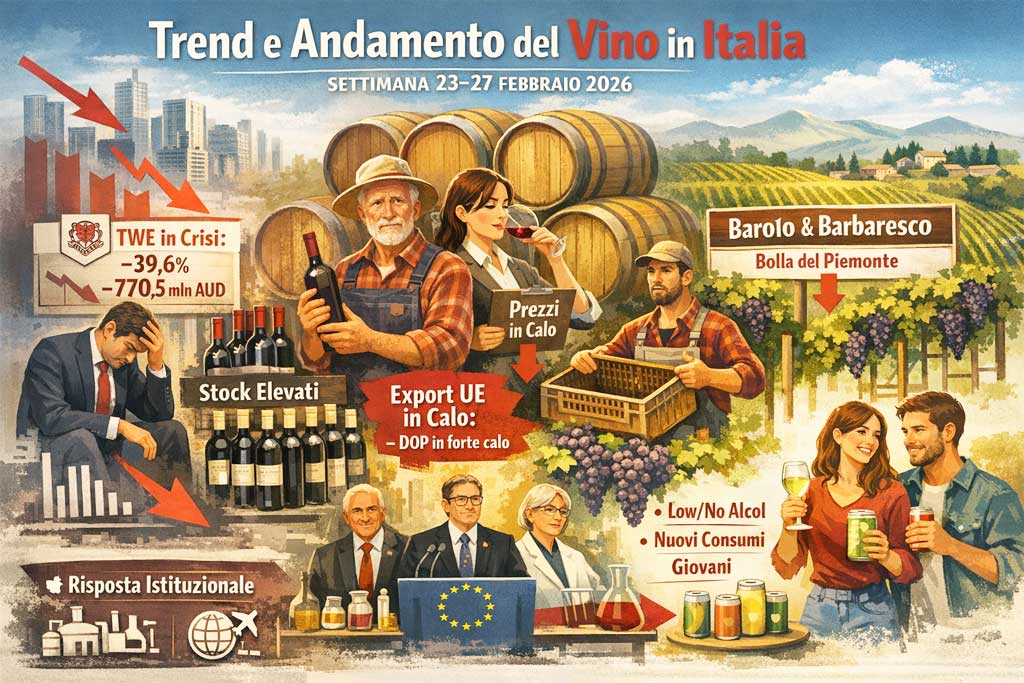 The most severe focus in Italy comes from Piedmont: consortia and supply chains describe a crisis comparable (in severity) to 2008, with full cellars and declining demand. Some key data: