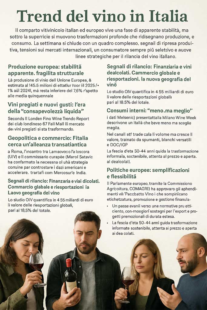 The week ends with a complex picture: signs of production recovery, tensions on international markets, an increasingly selective consumer, and new strategic lines for the relaunch of Italian wine.