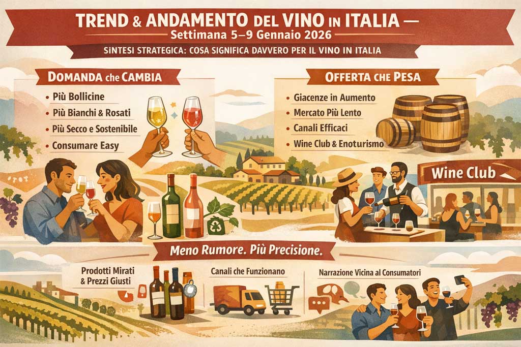 The week of January 5–9, 2026, captures an Italian wine sector undergoing structural transformation: on the one hand, the push for sparkling wines and “lighter” consumption; on the other, the growing weight of inventory and the need to rethink positioning, channels, and consumer relationship models.
